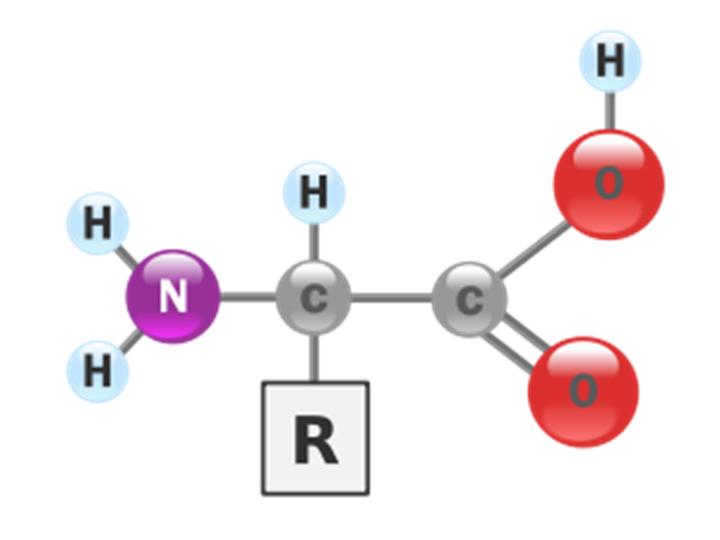 Aminoácidos são as unidades de construção das proteínas. Eles contêm um grupo amina (– NH2) e um grupo carboxílico (– COOH) na mesma molécula, ligados ao mesmo átomo de carbono adjacente ao grupo funcional, o chamado “carbono-alfa”. Cada aminoácido possui um pólo positivo e negativo. O carbono-alfa de um aminoácido possui quatro ligantes diferentes. Além de um átomo de hidrogênio, outro átomo ou grupo de átomos se liga ao carbono-alfa. Este quarto grupo de átomos é chamado de cadeia lateral, e é o que diferencia um aminoácido do outro. Existem 20 principais aminoácidos, encontrados em proteínas, cada um com uma cadeia lateral característica, o que confere propriedades físico-químicas específicas. Na Fig. 1, segue um esquema representativo da estrutura básica de um aminoácido e sua cadeia lateral posicionada.