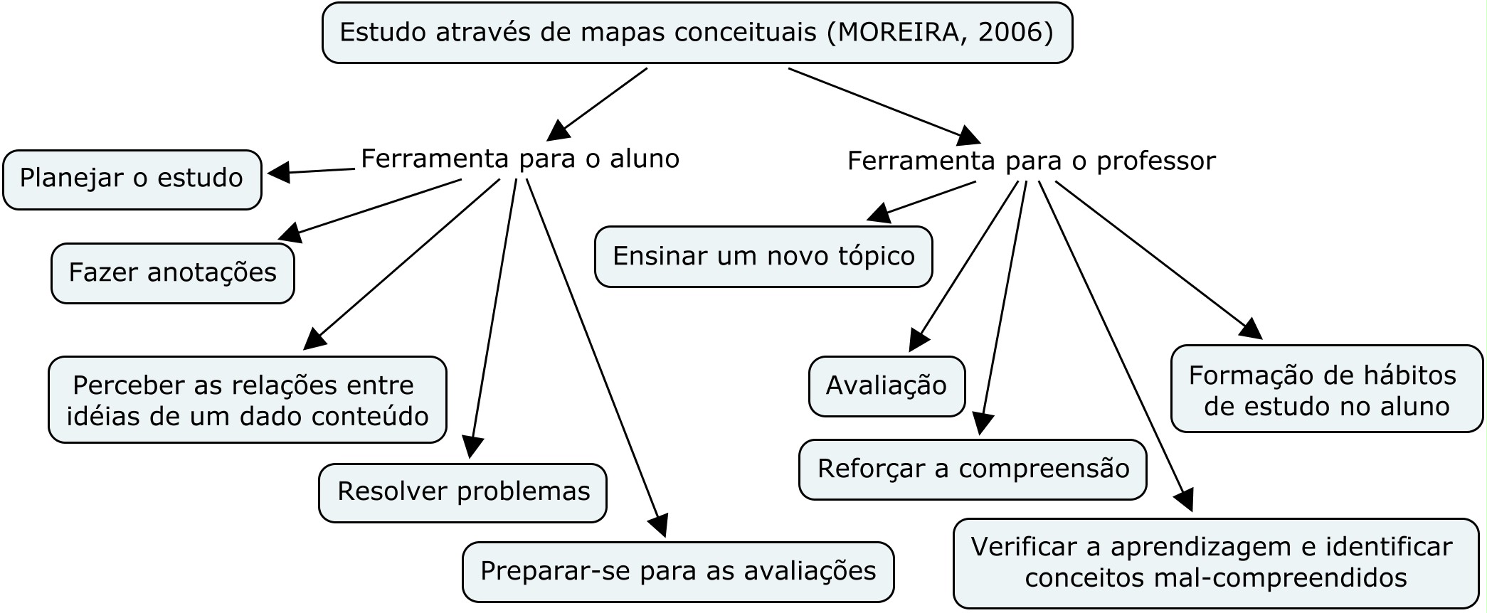 No mercado, encontram-se diversos softwares que servem como ferramenta para a diagramação de MC, como o freeware CMap Tools®. A construção de MC é um importante recurso auxiliar tanto para o aluno (aprendizagem) quanto para o ensino (professor). O mapa conceitual abaixo ilustra a contribuição dos mapas conceituais no papel de ferramentas de auxílio para alunos e professores: